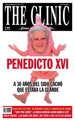 “La intolerancia radical de la tolerancia sin límites”. Donde todos pueden hablar siempre que no digan cosas incómodas. Un verdadero contrasentido. Resulta ser que en este mundo tan moderno, donde la libertad es un derecho inquebrantable e infranqueable, la libre expresión es permitida a unos sí y a otros no.La reflexión viene a cuento de la historia chilena a la cual quiero hacer mención, donde la revista “The Clinic” (según ellos la más leída de ese país sudamericano) salió hace unos días a quejarse, en su página de internet, que está sufriendo un boicot de parte del “grupo ultra católico y conservador” MuéveteChile. Todo, aseguran ellos, por culpa de una portada en que se muestra la cara del Papa montada sobre un condón rosa con patas y manos, imagen acompañada por el título “Penedicto XVI. A 30 años del Sida cachó que estaba la glande”. Si leyó bien… “Penedicto”. El caso rápidamente llegó a la prensa y propició un encendido debate público (aquí los motivos de MuéveteChile y aquí los de The Clinic).