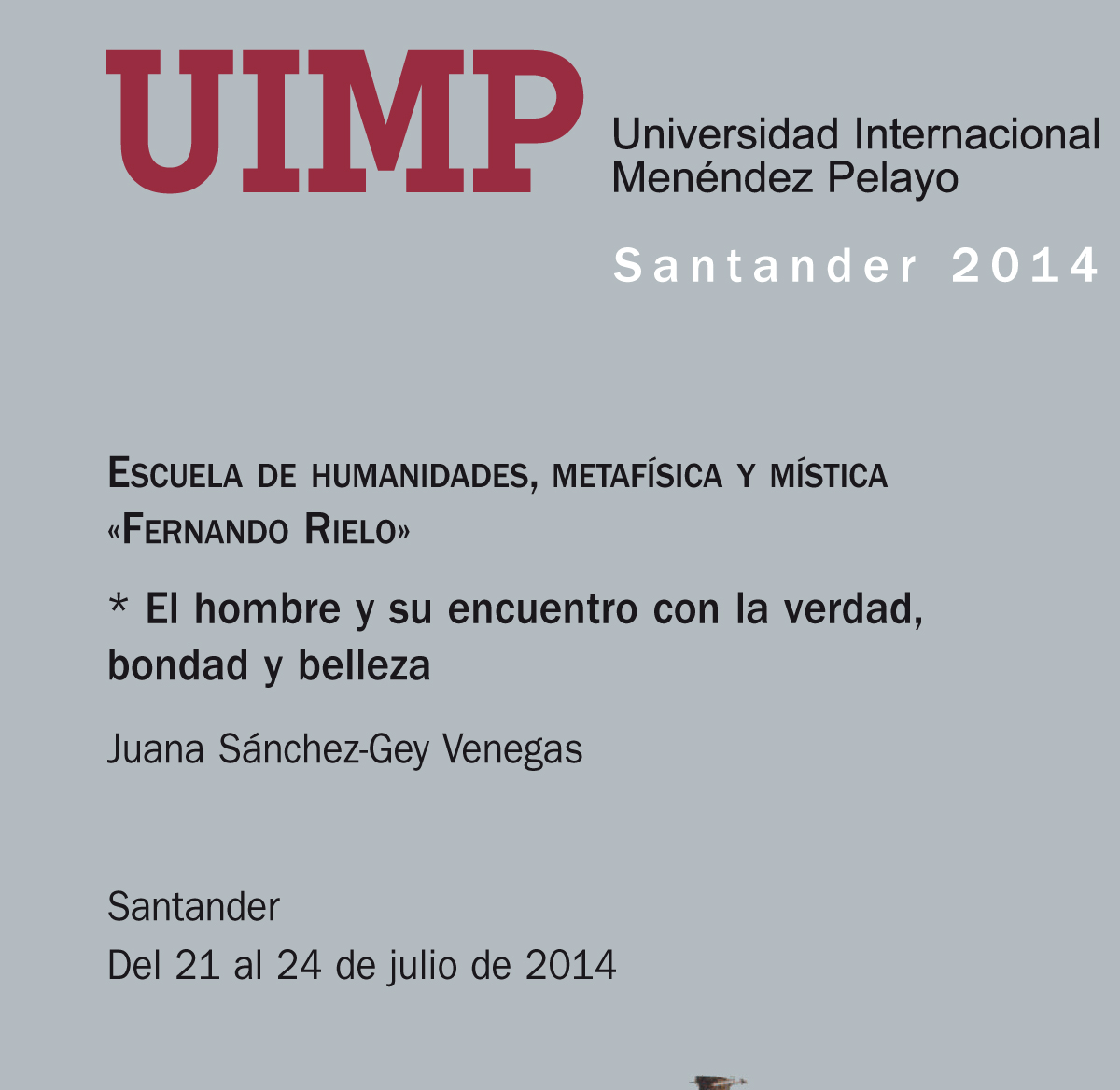 La Fundación Fernando Rielo organiza la Escuela de humanidades, metafísica y mística Fernando Rielo. Este proyecto, dirigido a profesores, doctorandos, estudiantes de masters, alumnos universitarios de las diversas disciplinas que se abordan y personas en general interesadas en las áreas de las humanidades, filosofía, espiritualidad, pedagogía, ciencias y artes comenzará con el curso El hombre: su encuentro con la verdad, bondad y belleza (del 21 al 24 de julio), que tendrá lugar dentro de los Cursos de Verano de la Universidad Internacional Menéndez Pelayo en su Sede del Palacio de la Magdalena, en Santander y que contará con el profesor Ciriaco Morón Arroyo, XXVII Premio Internacional Menéndez Pelayo.