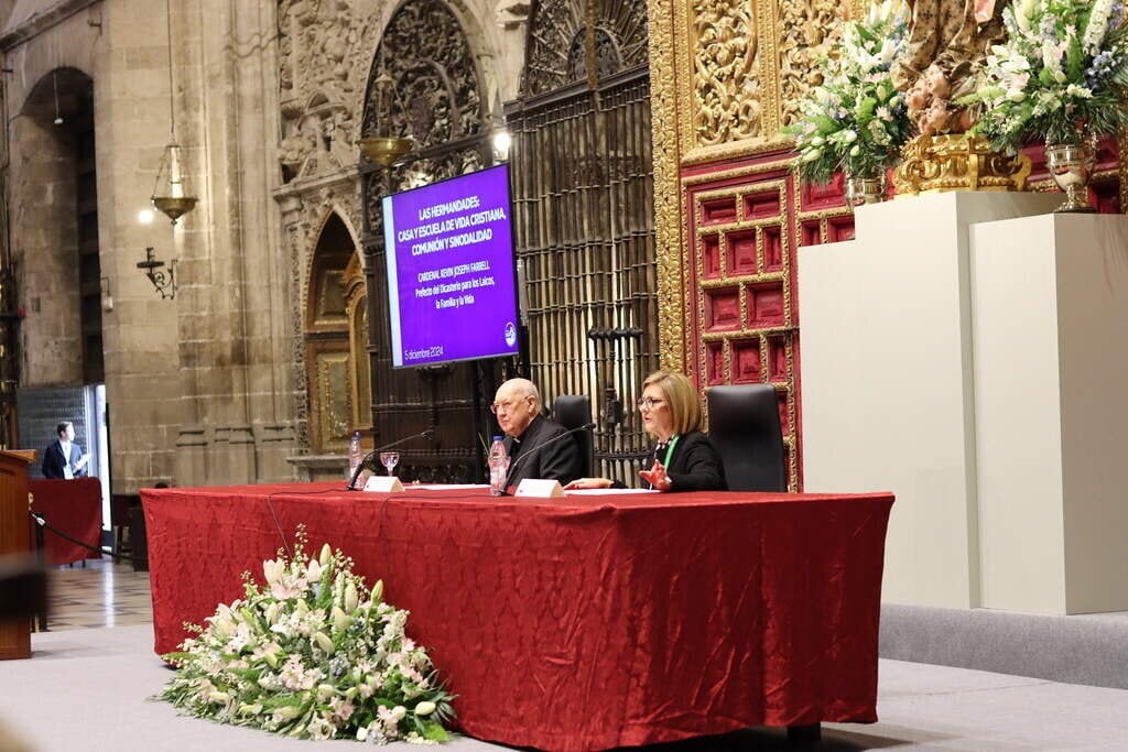 ‘Las hermandades: casa y escuela de vida cristiana, comunión y sinodalidad’. Este ha sido el tema de la ponencia con la que el cardenal Kevin J. Farrell, prefecto del Dicasterio para los Laicos, la Familia y la Vida, ha abierto la segunda sesión del II Congreso Internacional de Hermandades y Piedad Popular en el trascoro de la Catedral de Sevilla.