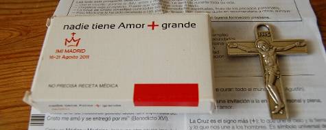 Entre los materiales incluidos en los miles de mochilas del peregrino, el más original ha sido un crucifijo incluido en una caja semejante a un fármaco, con un prospecto muy completo que explica qué es un crucifijo, para qué se utiliza, qué indicaciones y contraindicaciones tiene, advertencias, modo de empleo y qué ocurre si se omite esta "medicina".