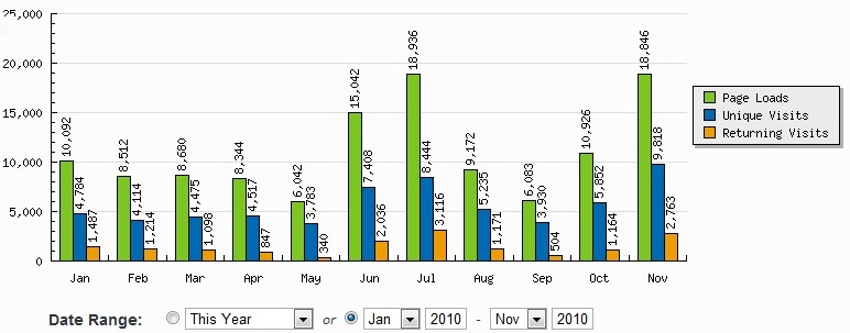Así, de 120.675 visitas en ese lapso en el 2009, subimos a 149,750, lo cual es un incremento del 24%, llegando a un promedio de poco más de 13.600 visitas mensuales. Muy modesto comparado con otros blogs, pero un indicativo de que nuestro material están llegando de forma efectiva a personas en todas partes del mundo (aunque mayoritariamente a España).