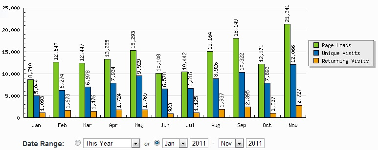 Para ApologeticaCatolica.org también ha sido un muy buen año. En cuanto a visitas también el incremento ha sido grande. Hemos recibido un total de 657.602 páginas visitadas en lo que va del año, en comparación con 498.566 del mismo período en el año anterior, lo cual representa un incremento del 32%, lo cual promedia un total de 59.782 páginas visitadas mensualmente.