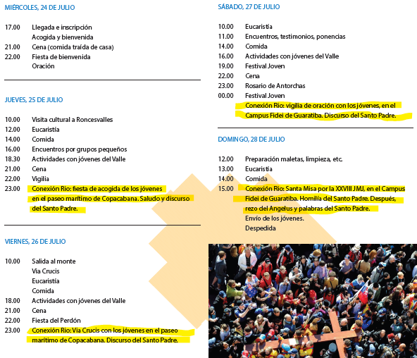 La delegación de Juventud de la archidiócesis de Pamplona-Tudela ha organizado un encuentro juvenil para disfrutar de unos días de convivencia, encuentro y oración de jóvenes de 14 a 30 años de toda Navarra. El encuentro tendrá lugar los días en el entorno de la Real Colegiata de Santa María de Roncesvalles, del 24 al 28 de Julio, coincidiendo con la JMJ de Río de Janeiro.