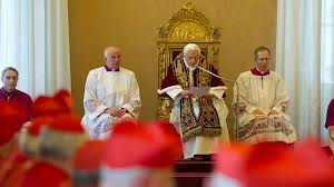 Terminado el rito del Consistorio, todos esperaban la bendición final del Papa. Pero Guido Marini, el maestro de las ceremonia pontificias, interrumpió el natural devenir del acto. Tomó una hoja blanca de papel y se la acercó a Joseph Ratzinger, quien comenzó a dar lectura al texto de su renuncia. Sentado en el trono, con su esclavina roja de borde blanco y su estola pontificia, de ribetes dorados. Sus anteojos sobre la nariz y su voz ronca.