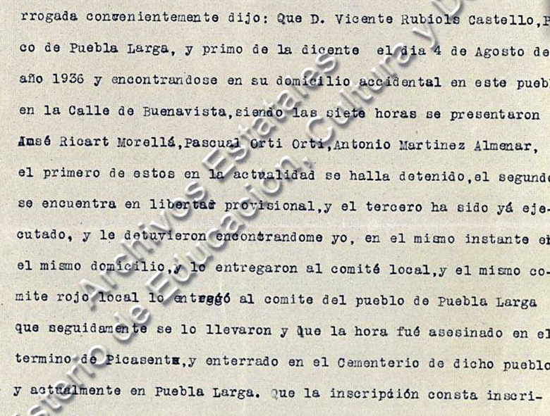 Vicente Gregorio Rubiols Castelló, natural de Gandía (Valencia) y de 62 años, párroco de La Pobla Llarga (localidad natal del mártir José María Amorós Hernández) desde 1898, fue asesinado el 4 de agosto de 1936 en la Torre de Espioca (Picassent, Valencia) y beatificado en 2001. Nunca se había tomado vacaciones, pero tras las elecciones del 16 de febrero 1936 le obligaron a dejar la parroquia, a la que pudo volver en junio, para tener que marcharse a Picanya, antes de estallar la guerra. Se comportó con discreción y prudencia pero el día 5 de agosto fue arrestado por milicianos de La Pobla Llarga, que lo llevaron a la carretera de Valencia, y al llegar a la Torre de Espioca, término de Picassent, pararon el coche y lo hicieron bajar. Él vio cuál era la intención y les dijo: “Sólo lo siento porque vosotros, a quienes yo he bautizado, vais a hacer este crimen”. Cuando dirigieron a él las armas gritó: “Viva Jesús sacramentado”. Tras fusilarlo, lo registraron, lo dejaron en postura vergonzosa y lo abandonaron. A los tres días un vecino de su pueblo lo reconoció e hizo que lo enterraran. En el expediente de Picassent en la Causa General (legajo 1385, exp. 8, folio 8) aparece como fecha de hallazgo del cadáver el 5 de agosto. En el de Puebla Larga (1369, exp. 7, folio 6) aparece en cambio como fecha el 12 de agosto y señala a tres sospechosos de participar en el crimen “por denuncia”. Sin embargo, Victoria Soda, vecina de Pincanya, fue testigo de que todo ocurrió el día 4 y nombra (folio 18) a las tres personas que se lo llevaron al comité de ese pueblo, que lo entregó al de Puebla Larga, y que habían sufrido suertes bien diferentes: uno fue fusilado, otro estaba preso y otro en libertad provisional.“Si hay que dar la vida nosotros la daremos”