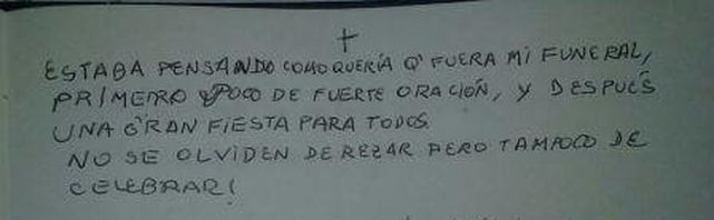 Te quiero mucho y bien lo sabés!”. Así se despedía una carmelita seglar de la hermana Cecilia María, de Carmelo de Santa Fe en Argentina, que se encuentra a unos 460 km al noroeste de Buenos Aires.“La hermana aceptó la traqueotomía como había aceptado todos los tratamientos: con paz y buena disposición”, relata a Religión Confidencial el padre Emilio. Pocos días después de la operación, un sacerdote le regaló una estampa de santa Teresita con una cita en francés. Ella tomó su cuaderno y escribió: “Yo he encontrado el secreto de sufrir en paz: yo deseo todo lo que Jesús quiera. Dios lo bendiga, me encomiendo para este tramo que me falta....".