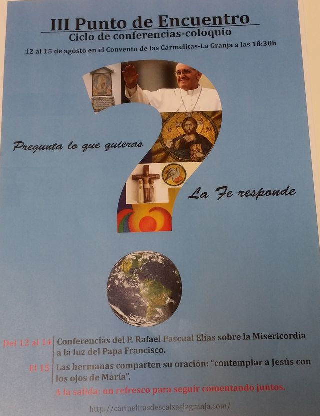 Las carmelitas descalzas de la Granja (Segovia) organizan del 12 al 15 de agosto un ciclo de conferencias-coloquio para jóvenes titulado “III Punto de Encuentro”. Estas jornadas se celebrarán en su convento y terminarán con un “refresquito”. El objetivo es impulsar la “cultura del encuentro” tal y como está pidiendo el Papa Francisco.