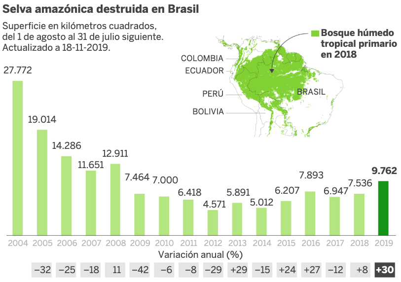 Desde que Rousseff asumió la presidencia esa tendencia se invierte y empeora la cantidad de área de la Amazonia destruída. El presidente Michel Temer mejora momentáneamente la situación durante dos años hasta que la llegada de Bolsonaro a la presidencia se encuentra con esa situación, aunque, como ya se ha dicho, sea un ejercicio en el que poco se puede achacar a la gestión de Bolsonaro.