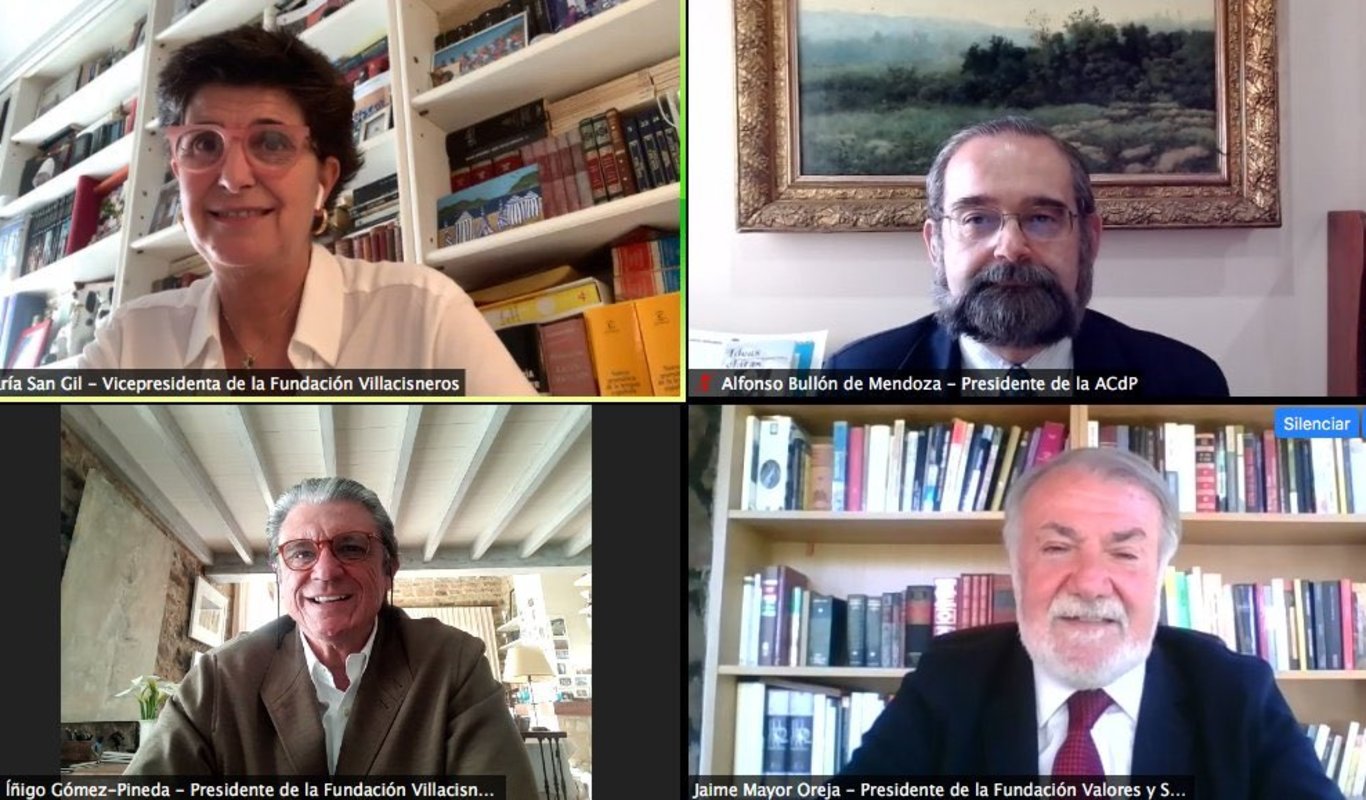 Alfonso Bullón de Mendoza, presidente de la ACdP, Íñigo Gómez-Pineda, presidente de la Fundación Villacisneros y Jaime Mayor Oreja, presidente de la Fundación Valores y Sociedad, moderados por María San Gil, vicepresidenta de la Fundación Villacisneros, hablaron del modelo de sociedad que se vislumbra tras la crisis sanitaria y económica debido al coronavirus.