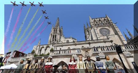 La Patrulla Águila del Ejército del Aire, 150 dulzaineros de once provincias y 36 peñas, asociaciones y casas regionales se han sumado al homenaje de la sociedad burgalesa a su monumento más querido, en una jornada que el arzobispo y presidente de la Fundación VIII Centenario de la Catedral. Burgos 2021 Mario Iceta ha calificado de “entrañable”, informa la web del VIII Centenario.